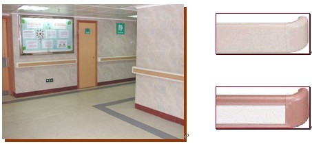 | 廠家提供五年原廠質(zhì)量保證! } 塑料墻面保護(hù)材料的底部更附有「不織布結(jié)構(gòu)」纖維承托層(non-woven fiber back),一方面增強(qiáng)產(chǎn)品的尺寸穩(wěn)定性(Dimensional Stability),有效地減低因溫差而出現(xiàn)的冷縮熱漲現(xiàn)象;另一方面又可使材料于將來更換時更容易整片撕下,簡化日后改造工程時所需的人力物力。 ~ 塑料墻面保護(hù)材料更能配合現(xiàn)代化醫(yī)院及老人中心均有安裝的各式「扶手欄」(Handrails),從而提供一套完善的墻壁保護(hù)和安全系統(tǒng)。